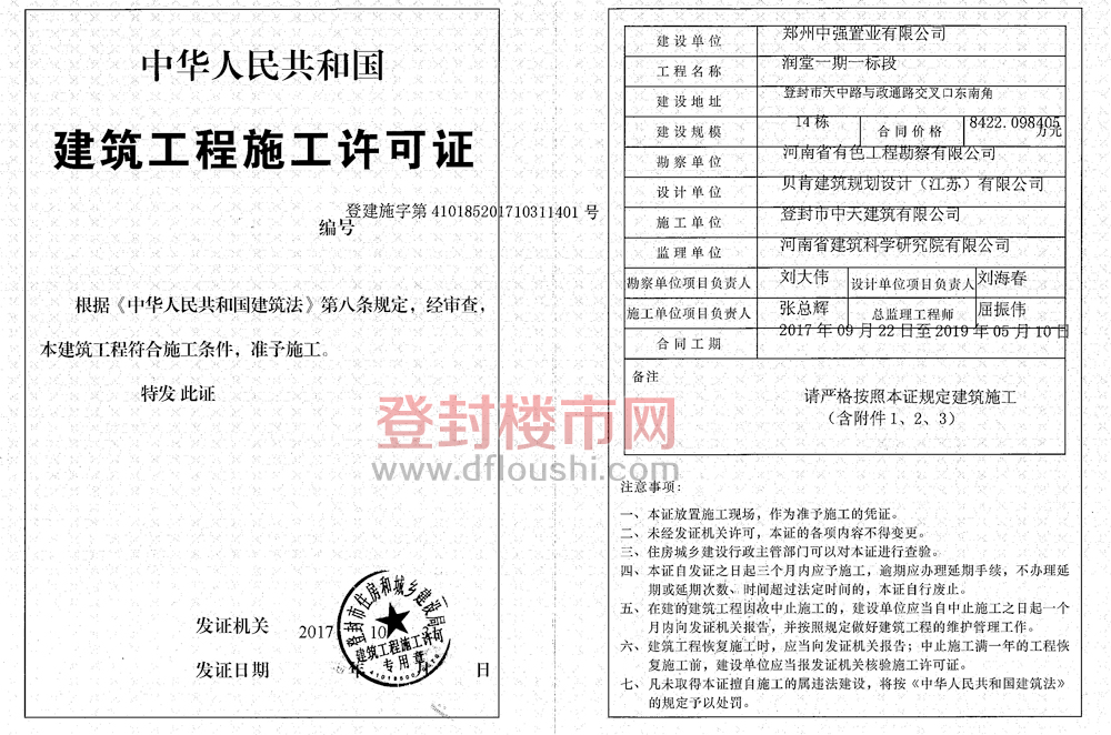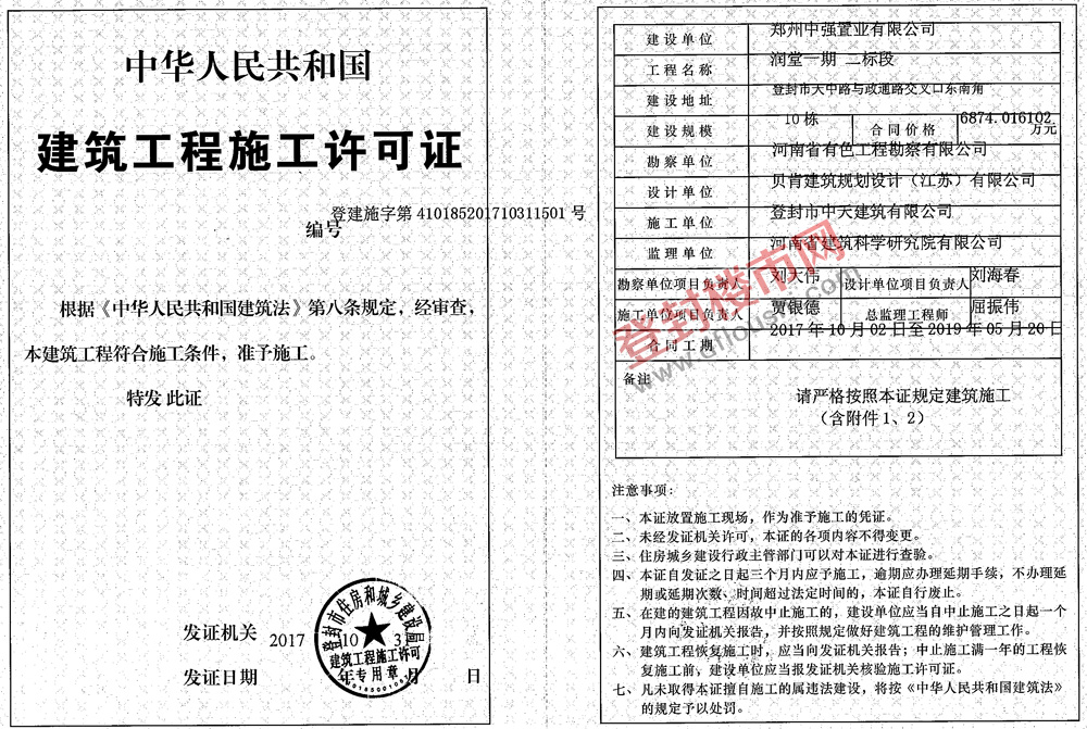 • ·建筑工程施工许可证:登建施字第410185201710311401、1501号